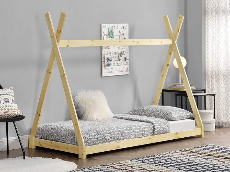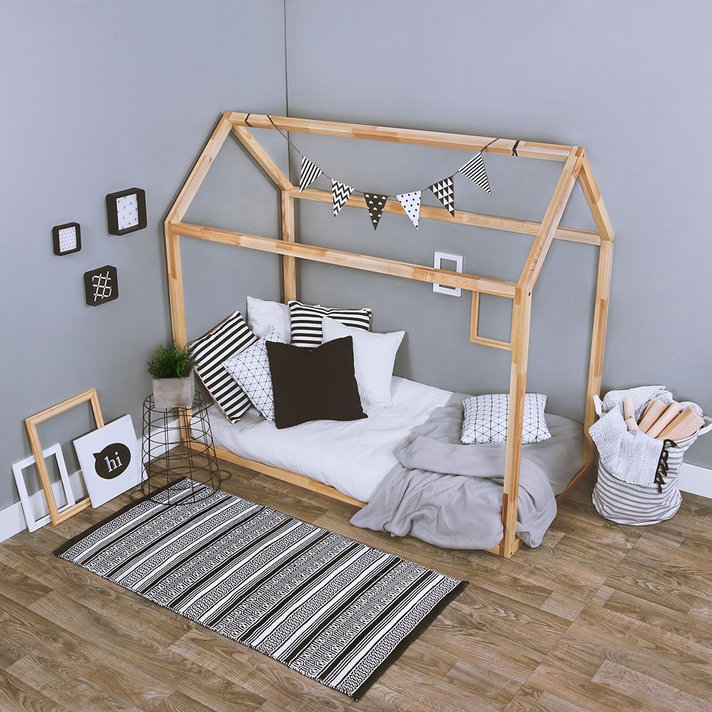 Sempre su Amazon troviamo un lettino montessori a forma di casetta, economico rispetto a tanti sul mercato ma sicuro e di nuovo in legno di pino (disponibile anche dipinto di bianco). Il materasso sta proprio a terra, ma appoggiato su comode doghe in legno per il benessere del sonno.