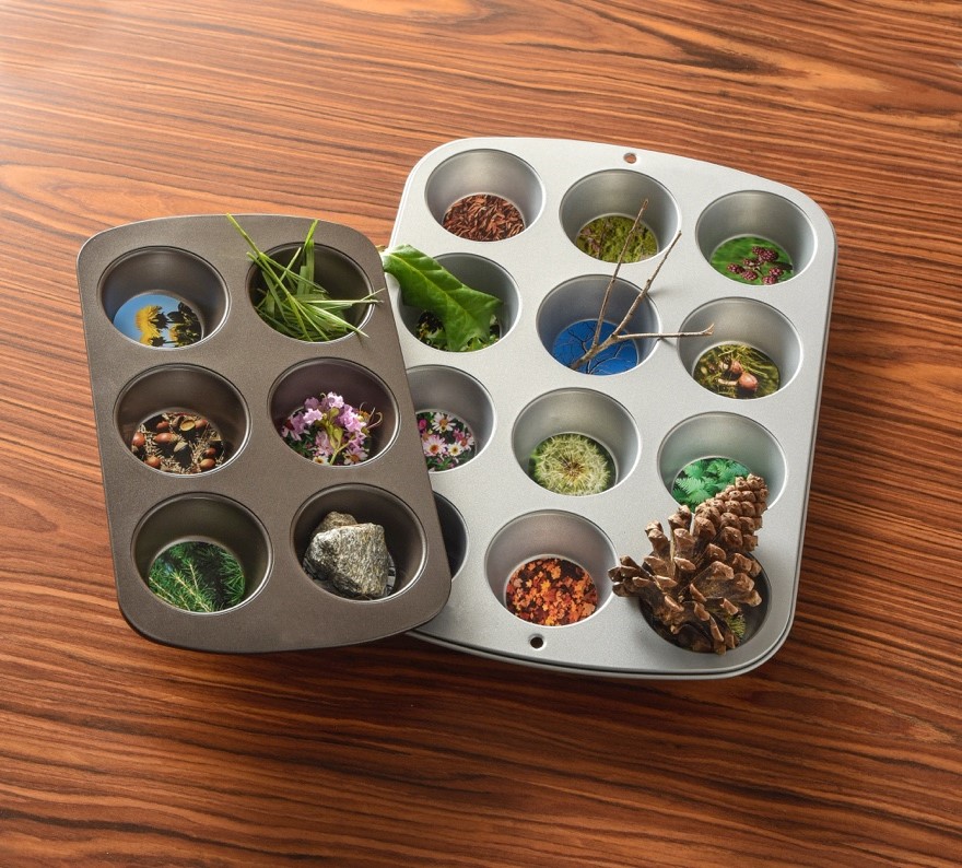 - Avete presente le muffin tin, gli stampini per cucinare le tortine? Sono utilissime e si rivelano ottime per tutte quelle attività di scelta e divisione, dal momento che le piccole cavità si comportano da mini-contenitori super ordinati, consentendo quindi di classificare. In casa li si può utilizzare per dividere e disporre materiali dello stesso colore, della stessa dimensione o dello stesso materiale, e lo stesso può accadere all'aperto: potete lasciare giocare i bambini alla "ricerca dei fiori e delle pigne", insegnandogli a disporre ciò che trovano in natura secondo colore o dimensione.
