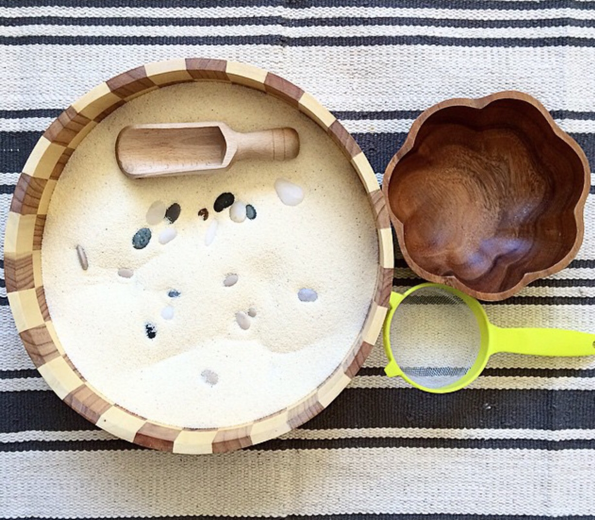 - Un altro gioco che coinvolge l'acqua, e magari la sabbia (quando disponibile), è quello del colino: travasare in una bacinella lasciando scivolare l'acqua o la sabbia tra le maglie di questo oggetto affascinante per i bambini è un gioco divertente e speciale. Nella sabbia troveranno i sassolini più grossi che non passano dalla trama, un po' come una caccia al tesoro.