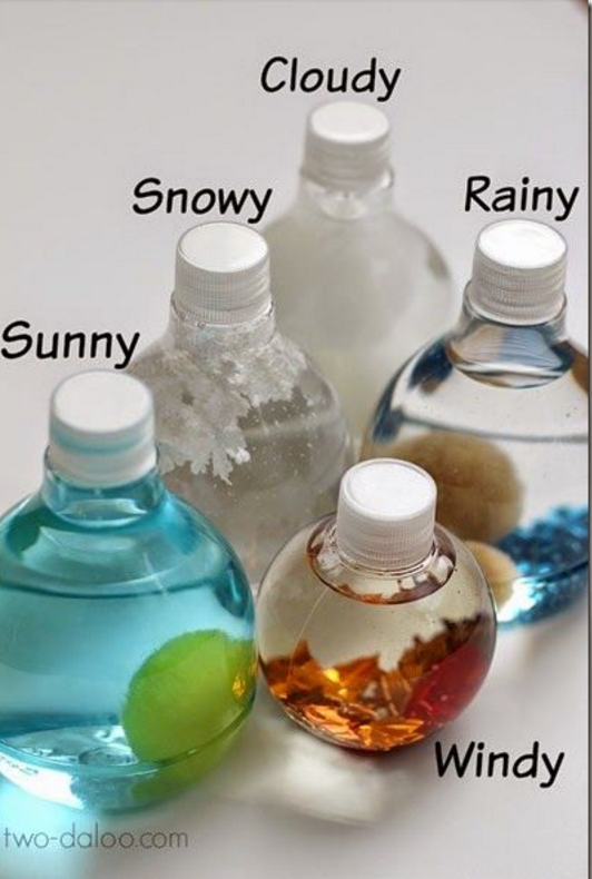 1. Bottiglia sensoriale che riproduce le condizioni atmosferiche (sole, vento, pioggia, tempo nuvoloso e nevoso)