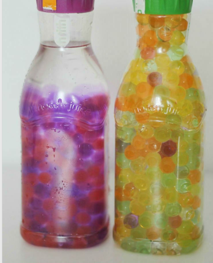 8. Bottiglie sensoriali con palline, semi e pon pon colorati