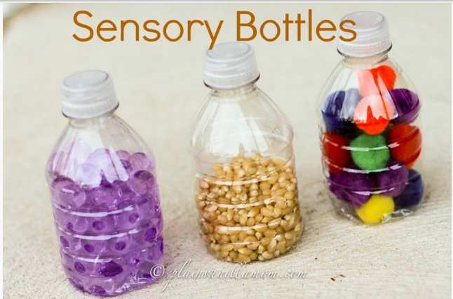 Il bambino potrà giocare con queste bottiglie, già a partire dai sei mesi d’età, con l’obiettivo di scoprire elementi sempre diversi e stimolare i suoi sensi. Le bottiglie si dividono in sonore, olfattive e visive, a seconda del tipo di materiale che desiderate sistemare al loro interno.