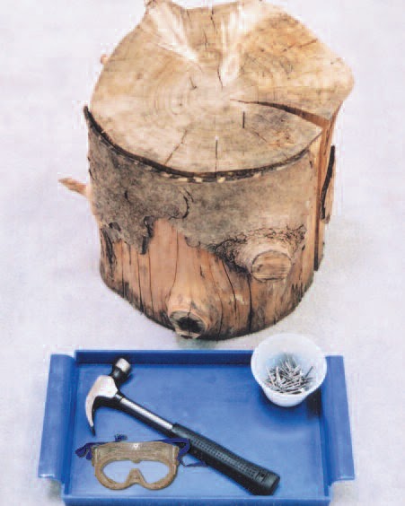 - Infilare i chiodi, come dicevamo, è un altro esercizio tipico della vita pratica montessoriana. Approfittate dei tronchi che la natura offre in grande quantità. Portate con voi un vassoio sul quale avrete appoggiato dei chiodini e un martello, insieme a dei guanti per non farsi male e a degli occhiali protettivi. E via di martellate! E' un'attività adulta e "pericolosa", ma, come per le forbici, il bambino deve imparare a coordinare la sua manualità anche con un senso del pericolo che se non sviluppato renderebbe tutto effettivamente più pericoloso!