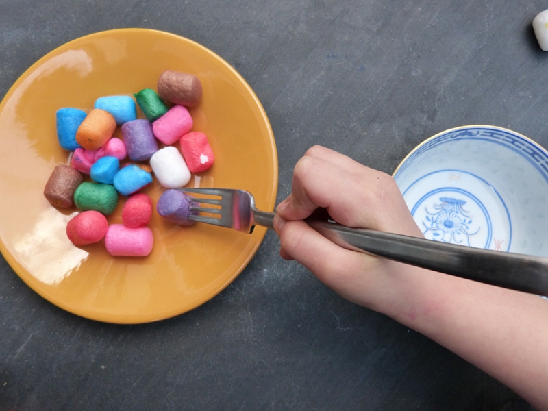 Il travaso degli oggetti solidi può essere eseguito semplicemente con le mani, per poi proseguire ma mano che il bimbo cresce con cucchiai, mestoli, imbuti e setacci.