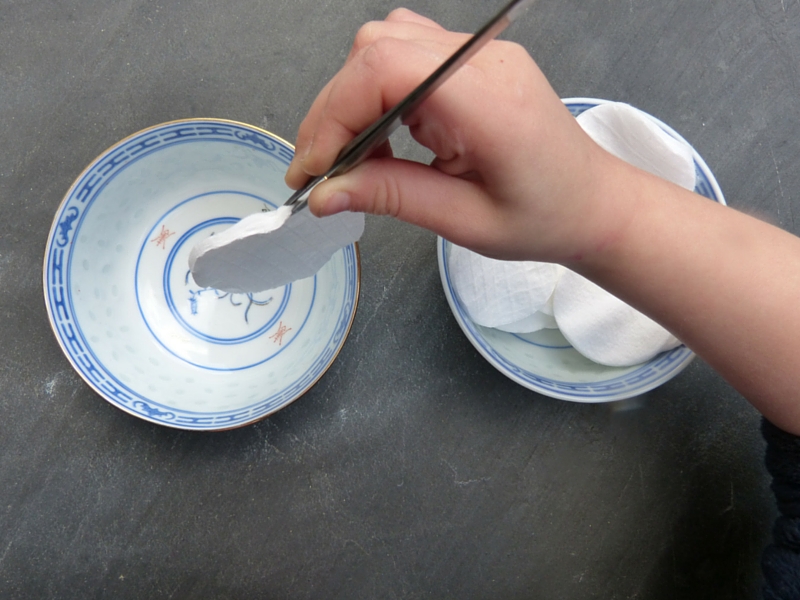 L'ordine, lo ripeteremo all'infinito, è fondamentale, e per questo quando si arriva alle attività proposte dalla pedagogista italiana sono presenti vassoi e bacinelle: all'interno del perimetro del vassoio vanno disposti i materiali, sistemati rigorosamente per aiutare il bambino a concentrarsi.