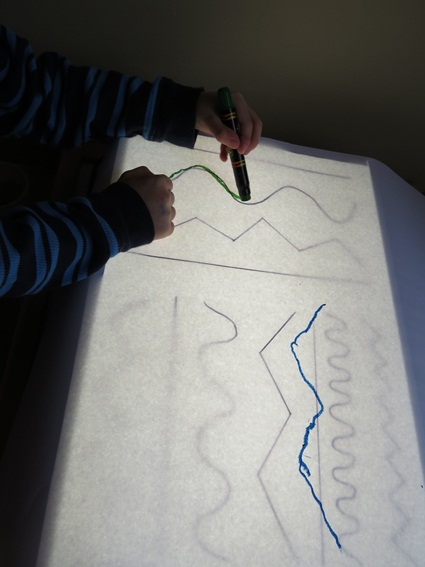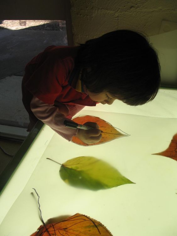 Il primo esercizio che viene in mente è naturalmente il ricalco: grazie alla luce in contrasto, i bimbi possono studiare le forme della natura, le venature delle foglie, i contorni dei fiori, i colori degli elementi, le sezioni dei frutti... E appoggiando un foglio sopra le materie scelte possono poi impegnarsi nel disegno, seguendo i contorni, le grinze, i petali.