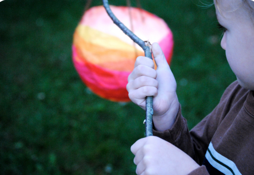 Prendete un palloncino e gonfiatelo, per poi ricoprirlo con dei piccoli pezzi di acqua bagnata insieme alla colla. Lasciate asciugare per il tempo necessario, anche tutta la notte se serve, e poi bucate il palloncino con un ago. Con un po’ di cera, o di colla, fissate il lumino sul fondo, create due piccoli buchi in cui far passare il fil di ferro e fissate la lanterna a un bastone.