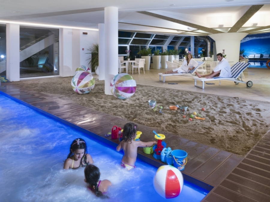 Oltre alla sabbia sono presenti anche una grande piscina (con un divertentissimo impianto di nuoto controcorrente a profondità baby), una vasca idromassaggio per adulti e la grandissima piscina Atlantide, di 200 metri quadrati, riscaldata e attorniata da una grande vetrata. I genitori possono così sorvegliare i bambini che si divertono rilassandosi, leggendo sui lettini (proprio come in spiaggia), godendosi un bagno o bevendosi un aperitivo comodi comodi.