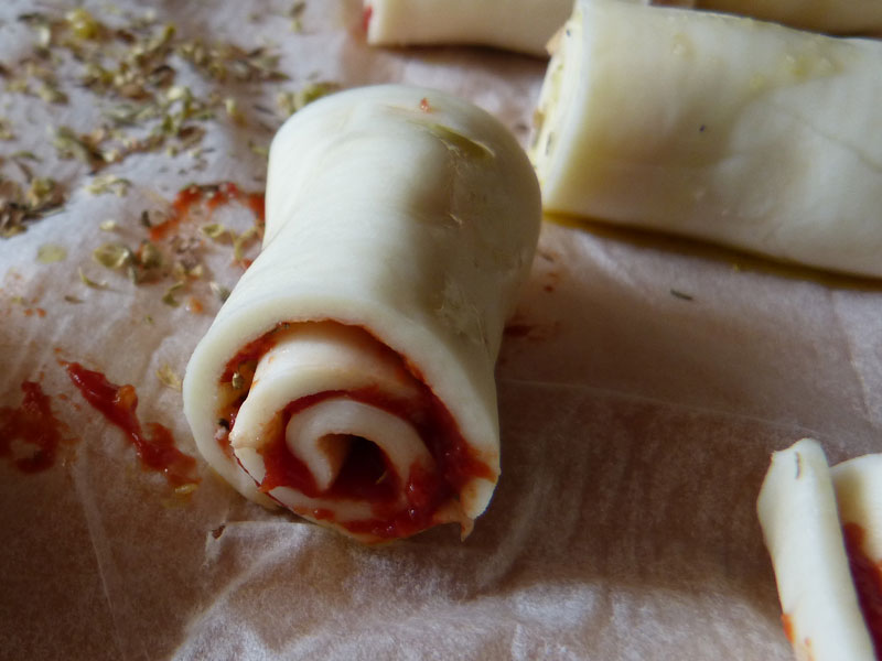 Spennelliamo la nostra sfoglia (va bene sia rettangolare che rotonda) con del concentrato di pomodoro, poi spargiamo sopra un po' di origano e un pizzico di sale. Tagliamo a striscioline la sfoglia e arrotoliamola su se stessa (circa due giri), poi tagliamo e proseguiamo con gli altri rotolini. Inforniamo per circa 30 minuti a 190°.
