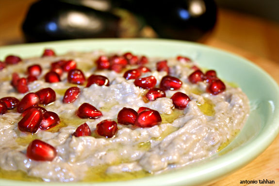 - Si chiama anche baba ganoush, ma altro non è che un hummus di melanzane: basta far abbrustolire per una mezz'oretta/tre quarti d'ora due melanzane belle grosse in padella (facendo qualche buchino con la forchetta per far uscire l'acqua in eccesso), tagliarle a metà e utilizzare la polpa al posto dei ceci, come nel normale hummus. Il gusto leggermente affumicato è davvero delizioso! Servitela con qualche chicco di melograno in superficie.