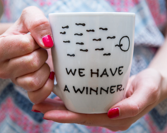 - Simpaticissima è quella con la scritta "abbiamo un vincitore", con un disegnino stilizzato dei suoi "girini" e del tuo ovetto. Potete realizzarla voi oppure trovarla online. Sarà divertentissimo, no?