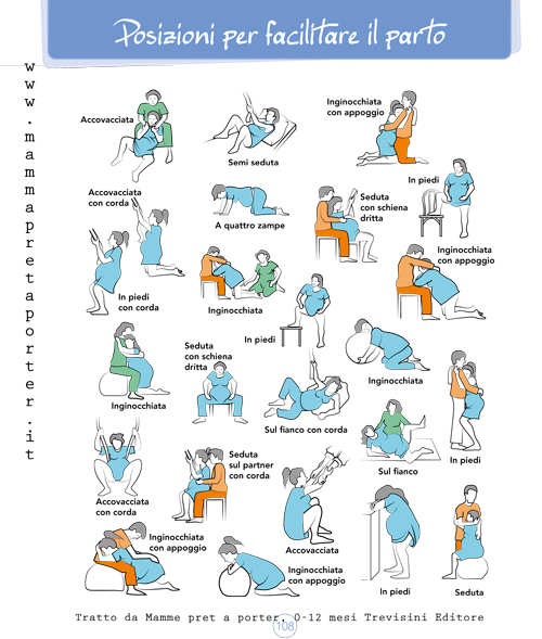 "Ecco ci siamo, siamo finalmente in travaglio, il fatidico momento è arrivato e... aiuto aiuto! Come ci mettiamo? Quale sarà la posizione migliore per partorire? La meno dolorosa, quella che ci fa accelerare i tempi, la più comoda per noi? La posizione in piedi e inclinata un po' in avanti è quella che facilita maggior- mente il lavoro dell'utero. In generale la posizione che vi dà maggiormente sollievo è quella più adatta voi in quel momento. Potete e dovete cambiare po- sizione e muovervi durante il travaglio: faciliterà il lavoro dell'utero. Sentiamoci libere di scegliere la posizione che più ci fa star bene. Non c'è motivo per cui si debba stare inchiodate a un letto, a una poltrona, a una sedia ecc. Abbiamo bisogno di muoverci; ma mi correggo... in realtà ognuna di noi ha bisogno di stare in qualche posizione diversa in momenti differenti "spiega nel nostro libro Mamme pret a porter, Mental Fitness Publishing, la nostra ostetrica ospedaliera Gabriella Di Gregorio.