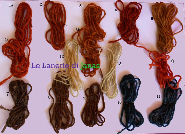 Il colore che otterrete con l’henné è variabile a seconda del capello di partenza: possiamo però avere un’idea dei tipi di henné naturali grazie all’azienda Sarda, Erbe di Janas che ha usato i suoi henné su lana bianca, ottenendo questi risultati.