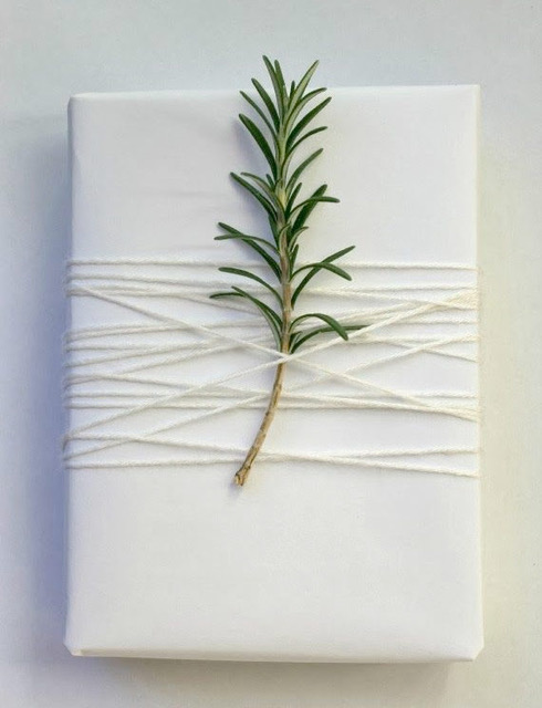 - E infine come impacchettare i regali? In maniera super rigorosa e semplice, ma con un tocco green e natalizio dato dal verde del rosmarino, infilato tra gli intrecci geometrici del filo di lana utilizzato come “fiocco”.