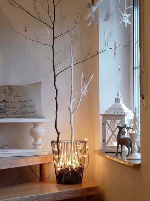 - Al posto del solito albero, però, potete anche portare in casa dei semplici rami spezzati che trovate in natura. Basterà lisciarli con della carta vetrata e (opzionalmente) dipingerli di bianco, appoggiandoli in contenitori di vetro riempiti con le lucine in disordine, per dare alla casa un’atmosfera super nordica.