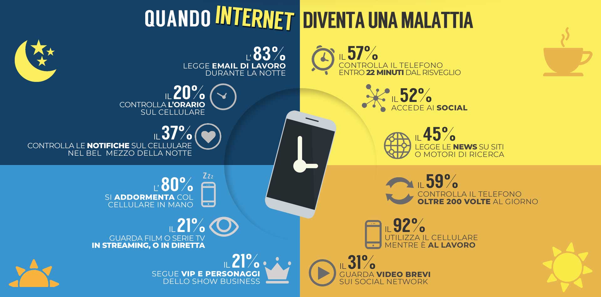 I numeri riguardanti l'utilizzo del cellulare e degli schermi parlano chiaro. Anzi, chiarissimo. C'è chi legge le mail di notte. Chi controlla il telefono svegliandosi. Chi si addomenta con il cellulare il mano. Chi controlla le notifiche oltre 200 volte in una giornata.