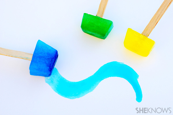6. E per rinfrescare ancora di più sapete che fare? Usare colori ghiacciati! Riempite dei contenitori per cubetti di ghiaccio di acqua e colorante naturale, e appoggiate (dopo averli lasciati una mezz'oretta in freezer) al centro dei bastoncini di legno. Lasciate ghiacciare per una notte e toglieteli dal contenitore: utilizzateli come pennelli su un foglio e il gioco è fatto.