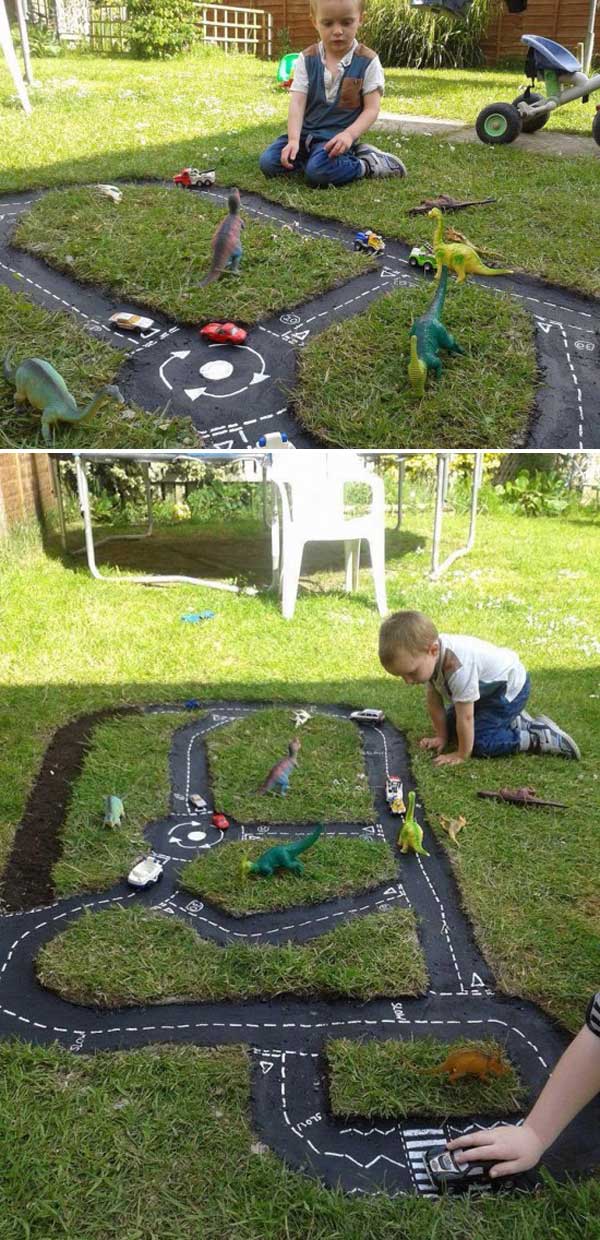 7. Ai bambini piacciono così tanto le piste per macchinine e trenini che è un peccato giocarci solo al chiuso. Potete realizzarne una mobile appoggiandola ai vasi in giardino, oppure riservare un angolo proprio per questa attività, utilizzabile tutte le volte che si vuole. E guardate, mica ci possono scorrazzare solo le macchinine! I dinosauri sono bravissimi a rispettare il codice della strada.