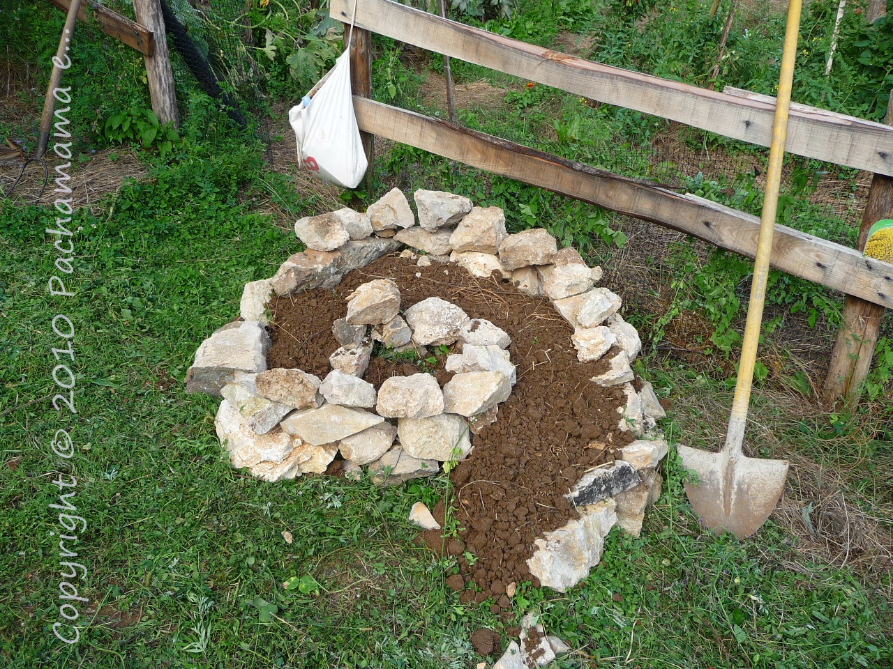 Iniziate subito marcando la zona scelta disponendo le pietre a forma di cerchio. Asportate quindi lo strato superficiale di terra dentro a questo cerchio, e in un punto alla base del cerchio (se volete) scavate una piccola buca per creare lo stagno (tenendo da parte il terriccio), coprendola con il telo apposito.