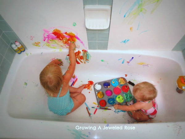 http://www.growingajeweledrose.com/2012/06/messy-play-in-bath-creative-art-station.html