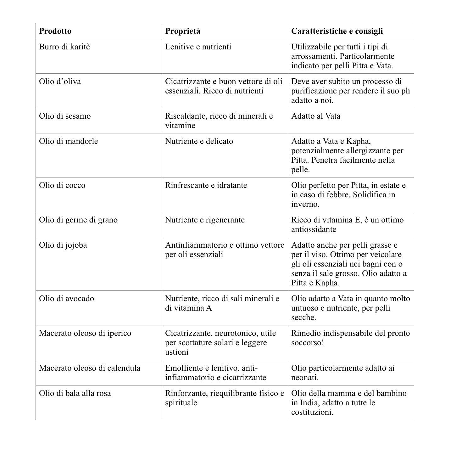 Ecco la mia lista di oli e burri e le loro proprietà tratti dal mio libro Mamme pret a porter, il primo anno insieme, edito da Mental Fitness Publishing interpretati secondo la teoria ayurvedica dei dosha: