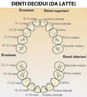 Intorno ai sei mesi quindi (ma non preoccupatevi se è prima o se avviene più tardi) inizierà a spuntare il primo dentino da latte. Solitamente si tratta di un incisivo inferiore, e cioè "i denti davanti", quelli che stanno nell'arcata inferiore della bocca. Nei due mesi successivi dovrebbero spuntare quindi i due incisivi superiori, quelli esattamente paralleli. Dopodiché si passa agli incisivi laterali (sopra e sotto), ai primi molari, ai canini e quindi, infine, agli ultimi molari. Il tutto nell'arco di circa un anno e mezzo, partendo dal primo arrivando all'ultimo. Mancano, rispetto ai denti adulti "definitivi", i premolari (e cioè quelli più in fondo) e gli eventuali denti del giudizio.
