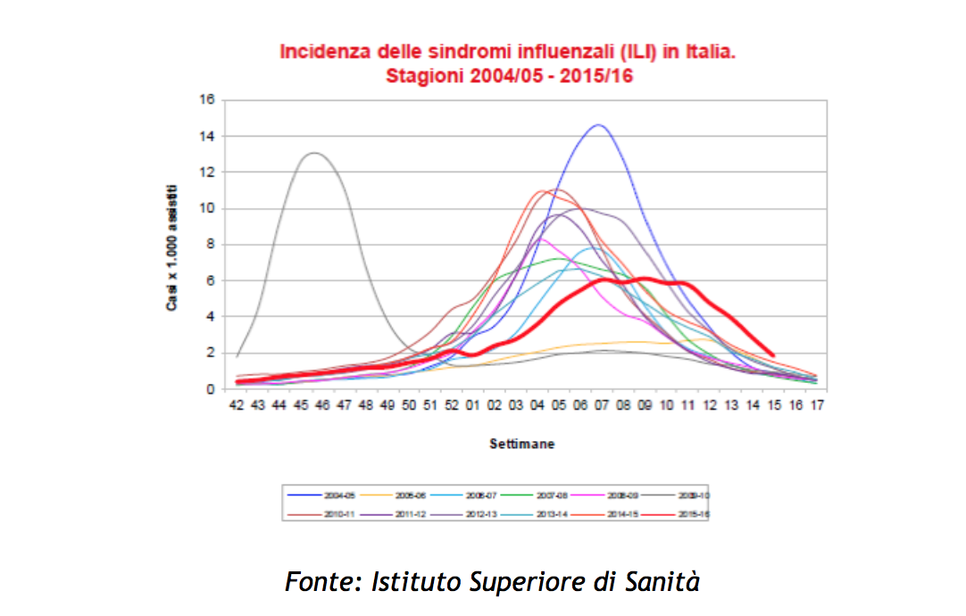 Secondo il rapporto InfluNet dell'Istituto superiore di sanità (Iss) la stagione 2015/2016 ha registrato circa 4 milioni e 597 mila casi di sindromi influenzali da ottobre 2015 ad aprile 2016. Se lo scorso anno l’influenza è comparsa in ritardo rispetto agli anni passati a causa dell’arrivo tardivo del freddo, per contro il clima altalenante che ha contraddistinto i mesi autunnali e primaverili ha facilitato la diffusione di virus simil-influenzali, responsabili delle sindromi influenzali, che si sono protratti per tutto il mese di aprile.
