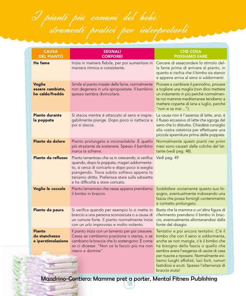 Partendo da questi presupposti abbiamo pensato di fornirvi alcune indicazioni di massima su come interpretare il pianto del neonato nel nostro libro, Mamme pret a porter edito da Mental Fitness Publishing: