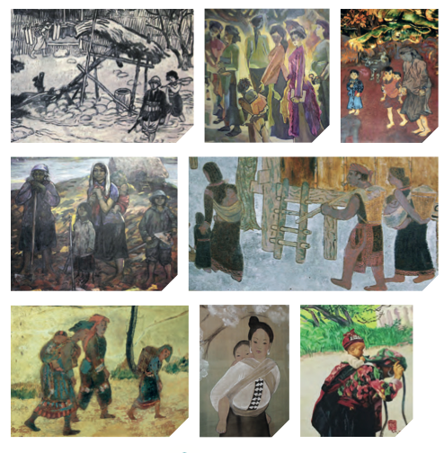, al lavoro e mentre accudiscono la casa, sempre con i loro bambini, spesso portati in fascia. Potete vedere di seguito una selezione di opere (o loro dettagli) realizzate tra il 1954 e il 1989, fotografate nei Musei di Hanoi e Ho Chi Minh City, l'antica Saigon.