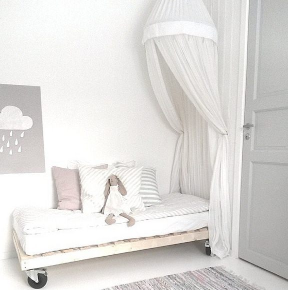 E con un pallet non si può solo fare una testiera ma anche uno splendido lettino Montessori con un accorgimento in più: le ruote per poterlo spostare (per cui può diventare un treno ma anche essere utille per i periodici cambiamenti che noi mamme amiamo fare!). E che dire poi dei cuscini, del coniglietto e della tenda principesca sopra il letto? Semplicemente stupendi.