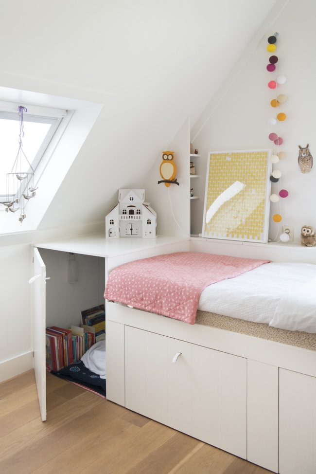 Non bisogna avere 50 mq di stanza per creare una cameretta deliziosa: basta sfruttare al meglio i mobili. Guardate questo letto cosa nasconde ai suoi piedi! Un fantastico spazio di lettura.