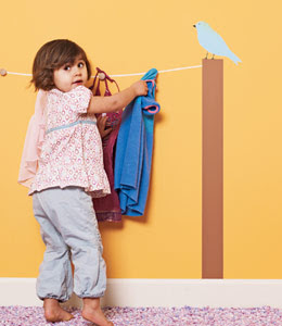 - Un filo della corrente di quelli dal sapore vintage che si trovano su deserte strade americane, e appollaiato lì sopra un tenero uccellino: il filo diviene poi la linea guida sulla quale applicare dei ganci per gli abiti. Il risultato è un appendiabiti alternativo e divertentissimo agli occhi dei bambini.
