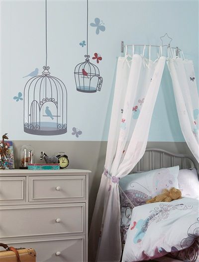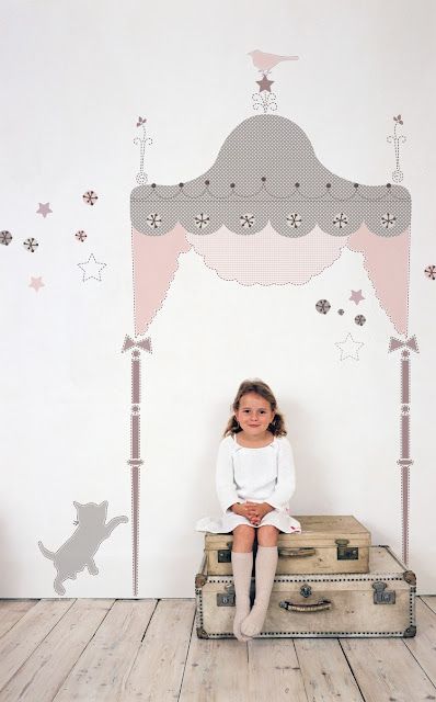 - La sagoma di un baldacchino è perfetta per le camerette delle femminucce. Potete appiccicarla sopra il letto, proprio al posto della testiera, oppure decontestualizzarla (come qui) creando un angolino per la lettura o per il gioco.