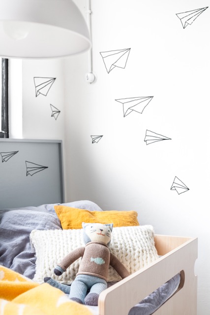 - Meno romantico ma davvero bello è l’adesivo-aeroplanino, molto nordico con le sue linee pulite e geometriche. Da ripetere come un pattern.
