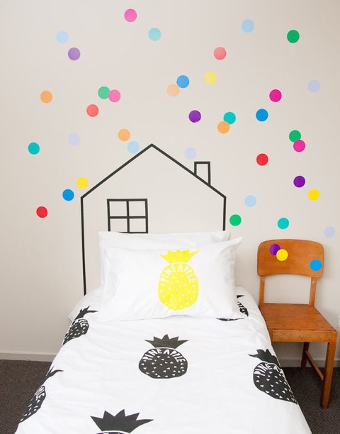 - Con della carta da cassetti (quella autoadesiva) potete ritagliare delle casette di vari colori e pattern e realizzare sulla parete un villaggio colorato e accogliente.