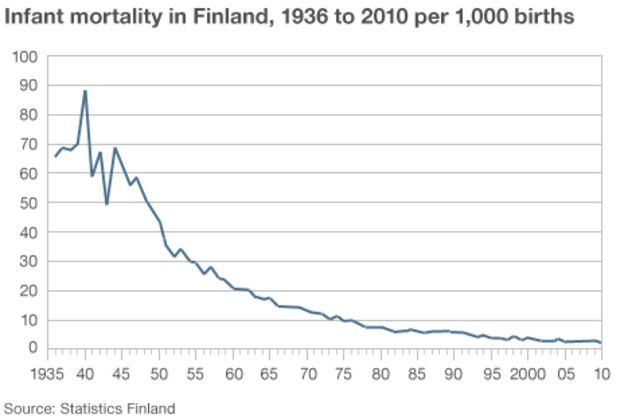 Quando nasce un bambino, in Finlandia ogni mamma riceve una baby box. Cos’è? Una scatola con dentro tutto l’occorrente per accudire il bambino nei primi mesi: bavaglie, biberon, ciuccio, copertina, pannollini, body, tute da neve, giocattoli per la dentizione, forbicine per le unghie, un libro illustrato, una spazzola per capelli, un asciugamano, calze, federe, lenzuola... Un “maternity pack”, insomma, per dare il benvenuto alla famiglia.
