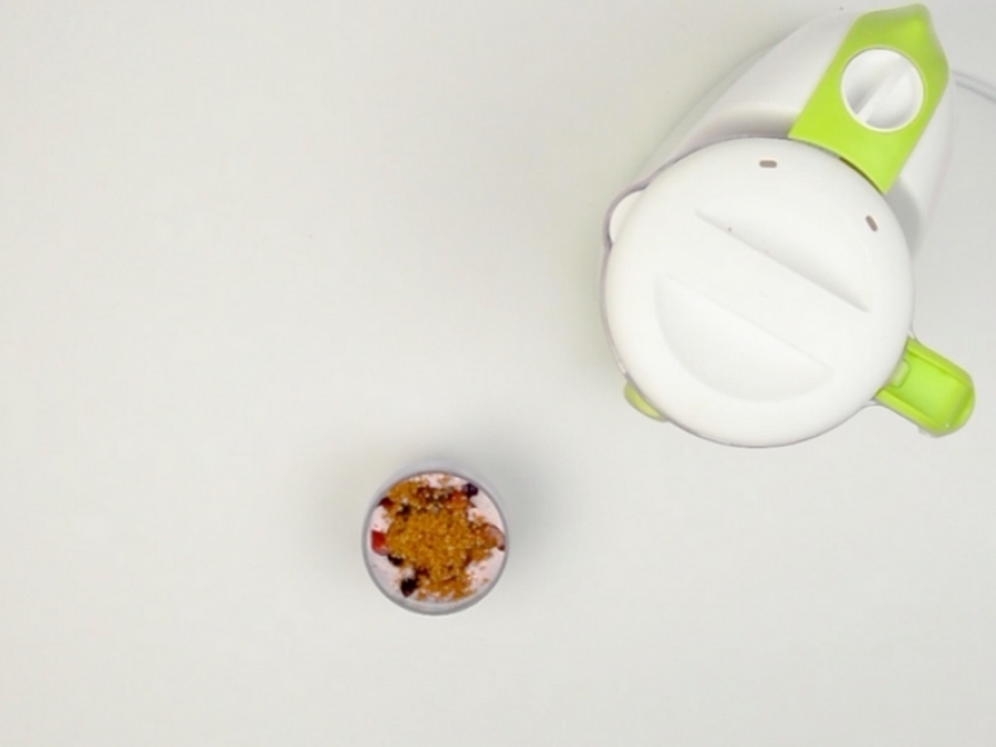 Frulliamo insieme i biscotti e il burro di mandorle, fino a che non otteniamo un composto omogeneo (una sorta di crumble), che verseremo sul fondo nel bicchiere facendo uno strato compatto di circa 1 centrimetro (schiacciandolo con il cucchiaino).